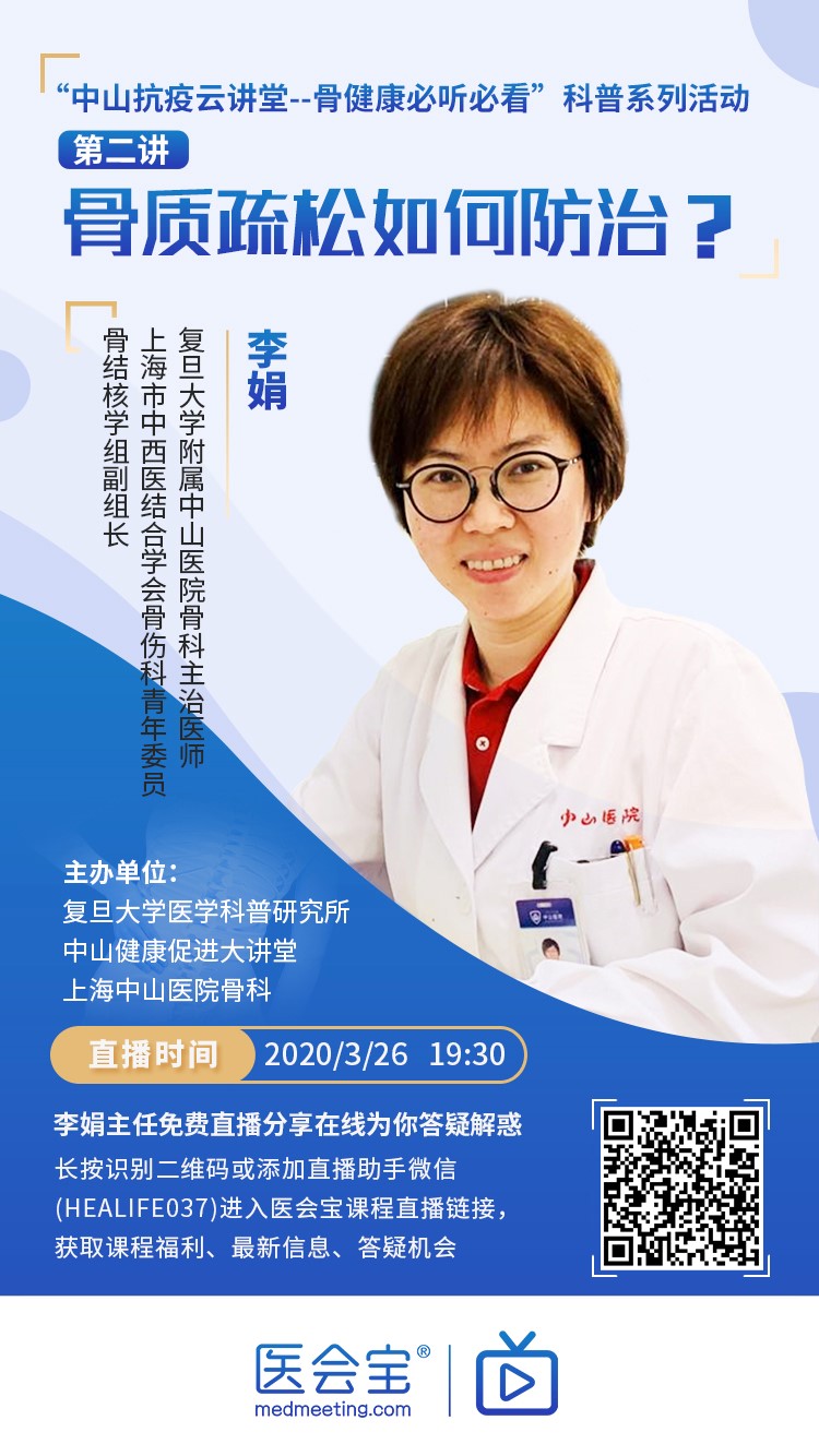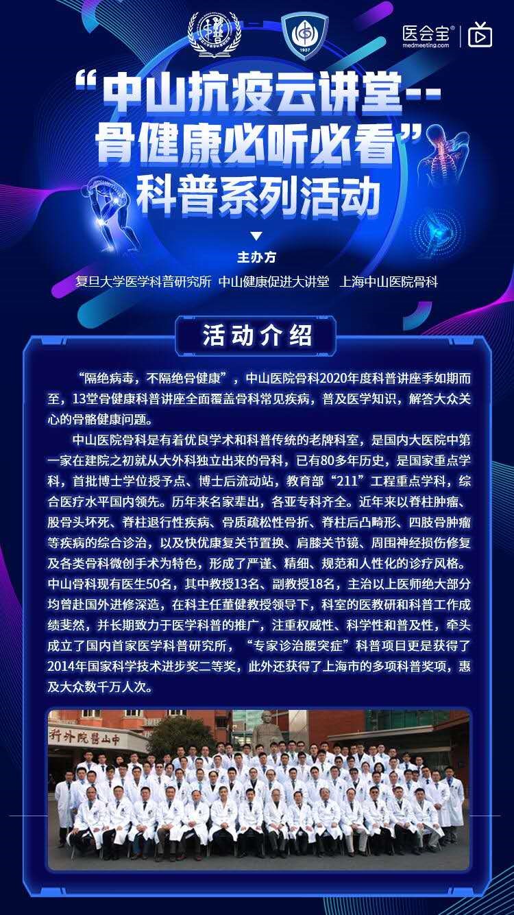 “隔绝病毒,不隔绝骨健康”,中山医院骨科2020年度科普讲座季如期而至,13堂骨健康科普讲座全面覆盖骨科常见疾病,普及医学知识,解答大众关心的骨骼健康问题。